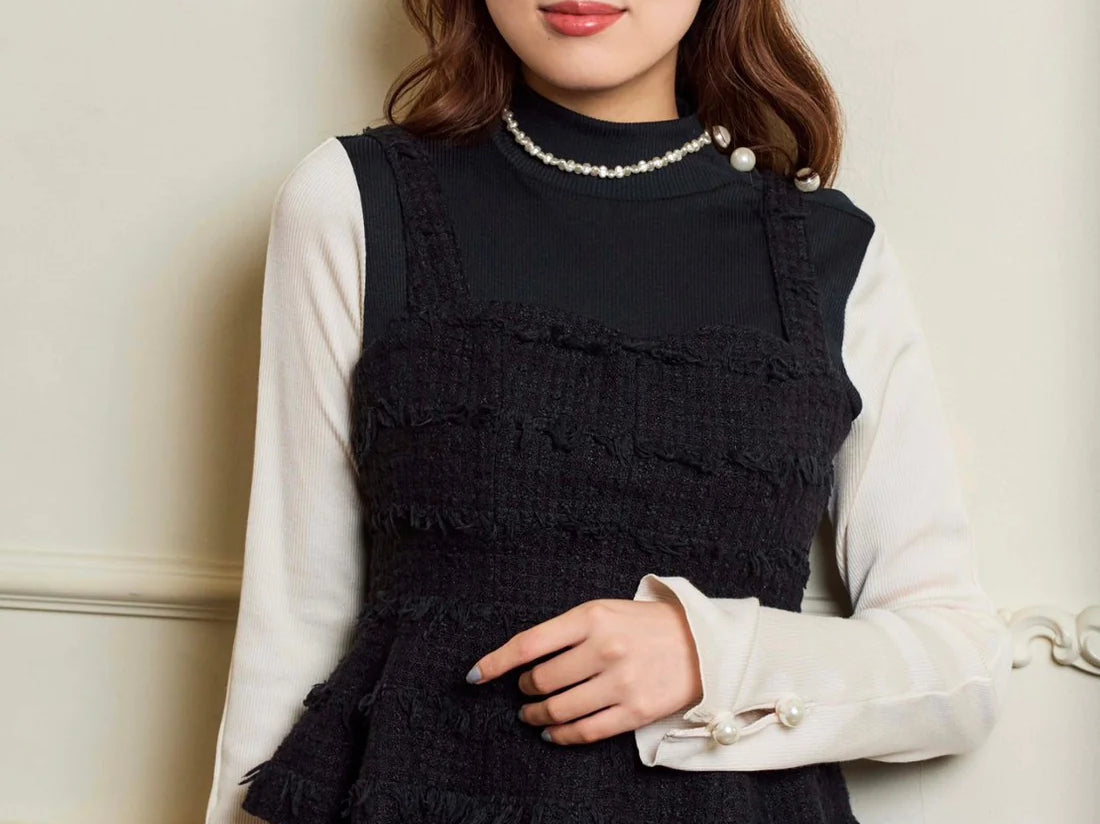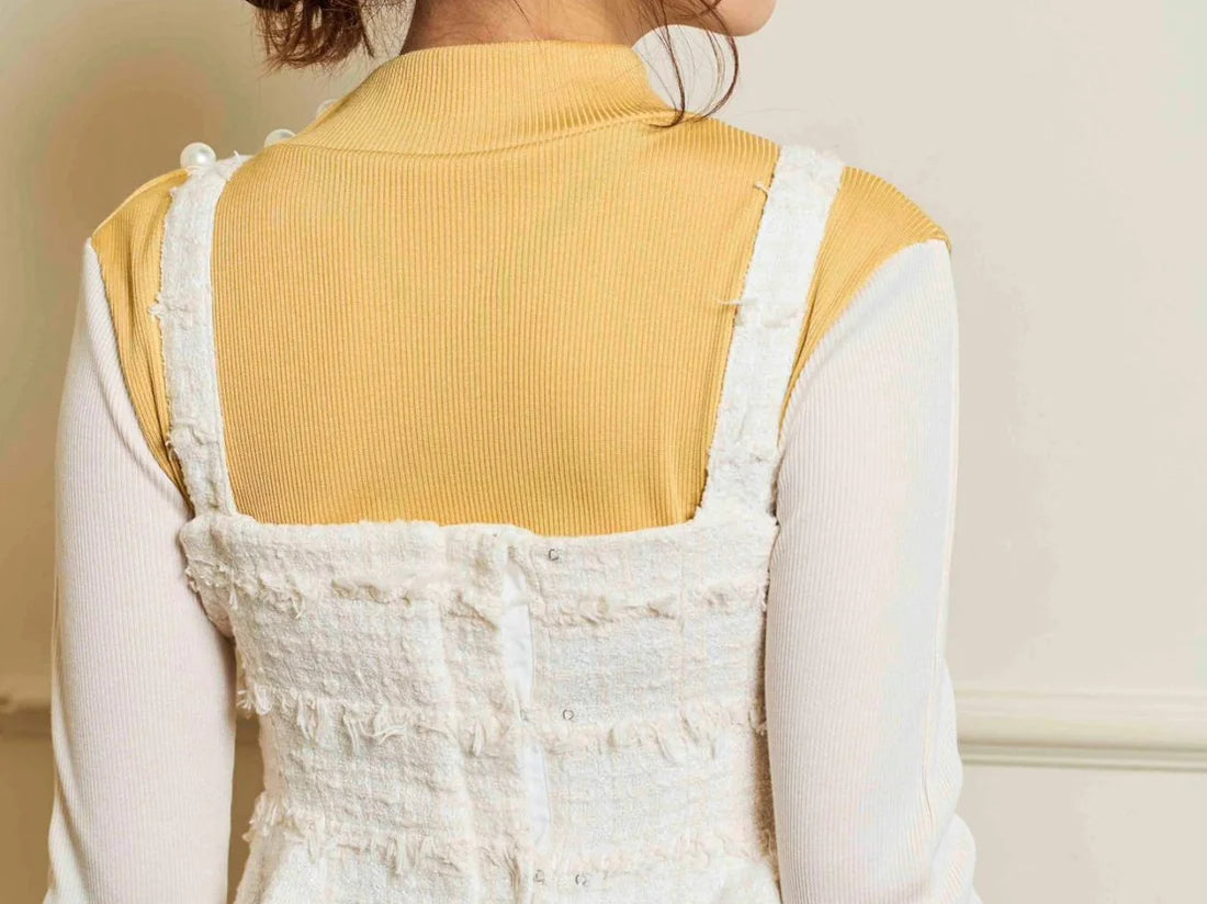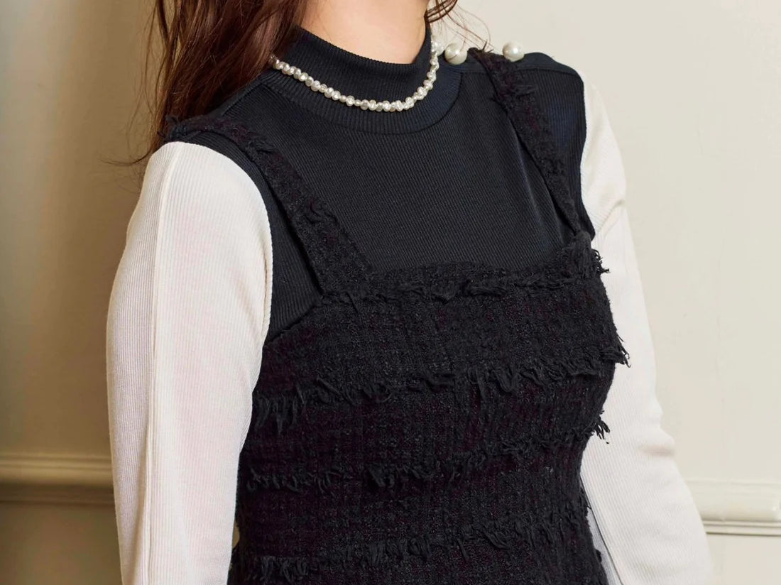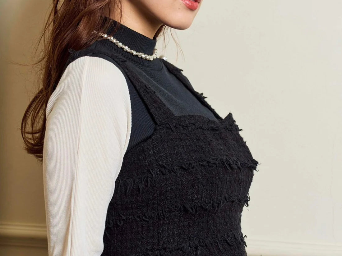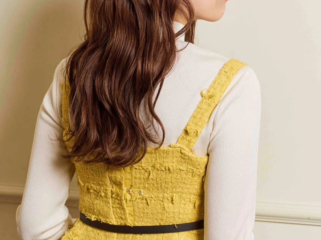 A peplum hem bustier with a three-dimensional fringe-like tweed. The straps are placed slightly outward to accentuate the cut at the bust, creating an elegant design.