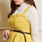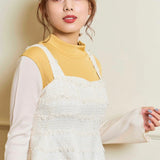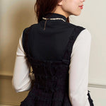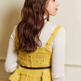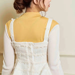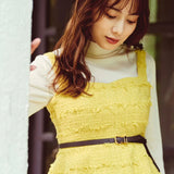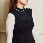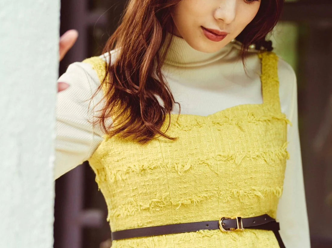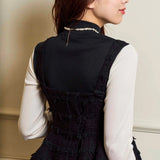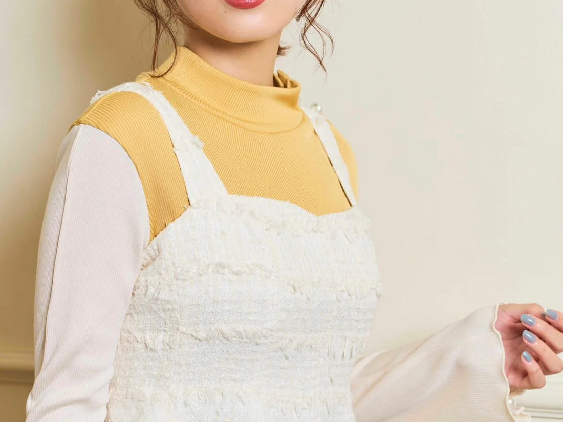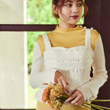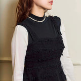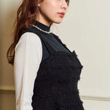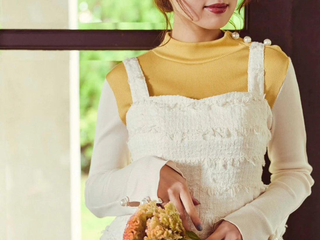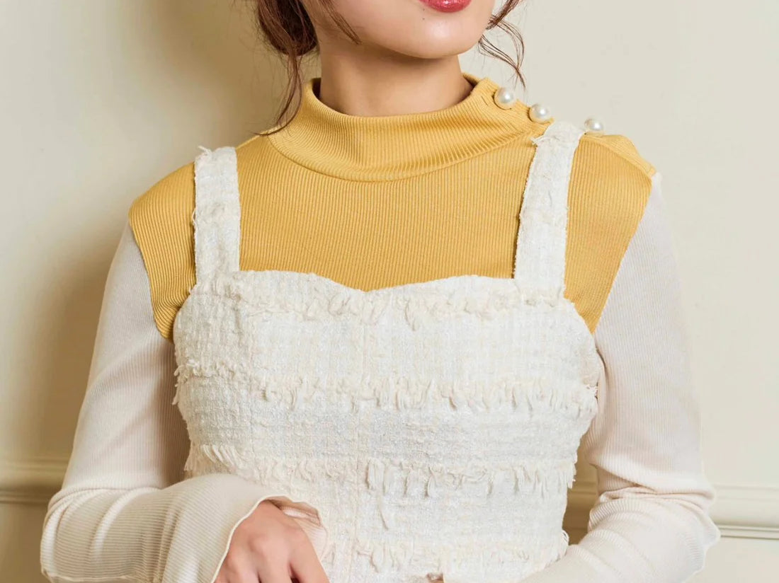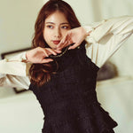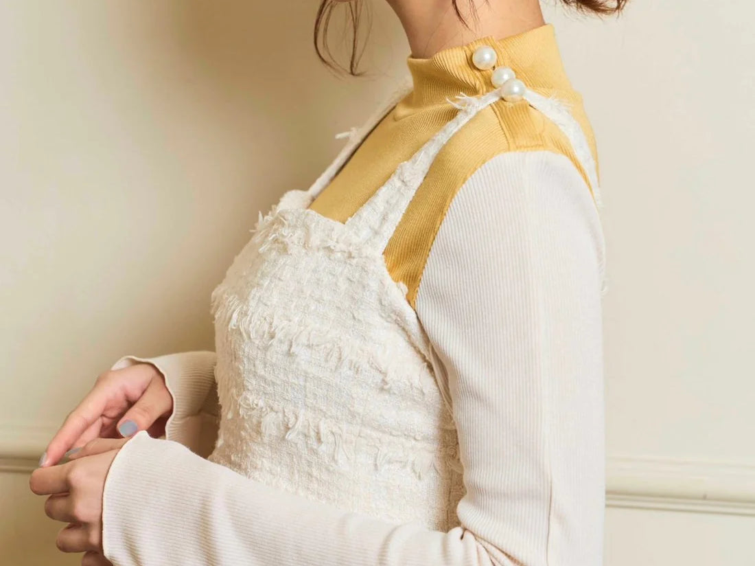 A peplum hem bustier with a three-dimensional fringe-like tweed. The straps are placed slightly outward to accentuate the cut at the bust, creating an elegant design.