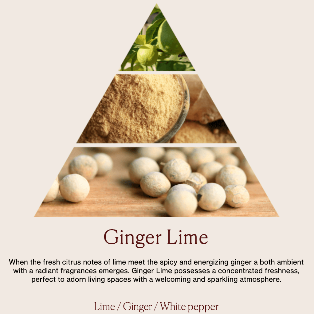 An ambient fragrance with a radiant character, where the fresh citrus notes of lime meet the spicy and energising ginger. Ginger Lime is a concentrated freshness, perfect to adorn living spaces with a welcoming and sparkling atmosphere. Stimulates mood, reduces feelings of anxiety and fatigue while helping to improve concentration and enriches the air with purifying components._