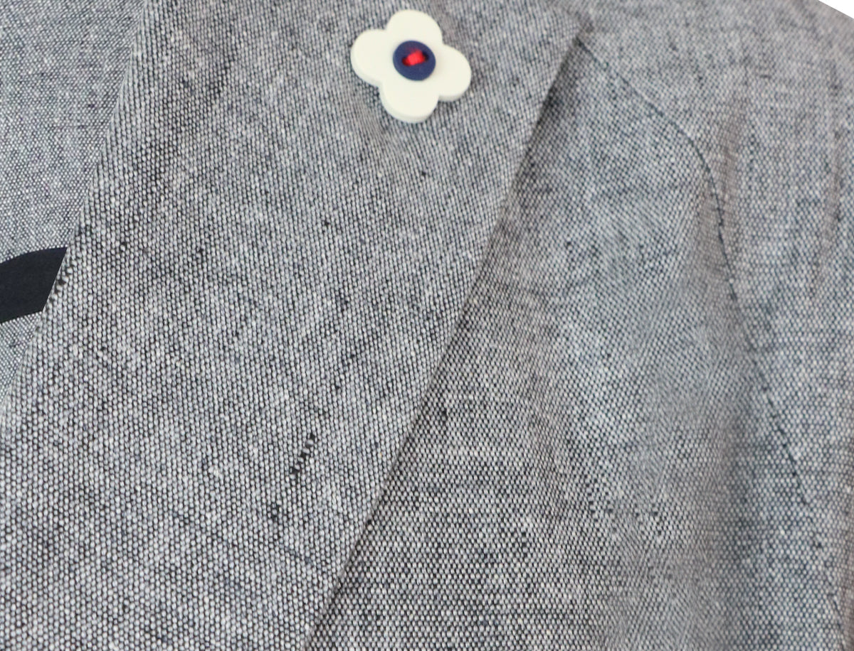 カジュアルなランチから、愛する人とのキャンドルライトディナーまで楽しめるように作られたこのクラシックなブレザーは、高品質の亜麻混紡素材を使用しており、ノッチドラペル、機能的な隠しポケット、非常にクリーンな外観を実現する隠し前立てが特徴です 。左ラペルの先端にラルディーニの特徴である花柄のピンをあしらい、ジーンズと合わせてカジュアルに仕上げたり、テーラードパンツと合わせてスマートな印象に仕上がります。