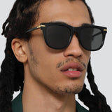 The style, hewn from recycled black acetate, is complemented by custom engineered hinges and adjustable nose pads finished with 22-carat yellow gold plating. The frame is fitted with solid grey Zeiss technology lenses for optimum clarity and UV protection. Discreet logo details are applied to the top of the frame and at the hinge. 100 % UVA and UVB protection. Asian fitting.