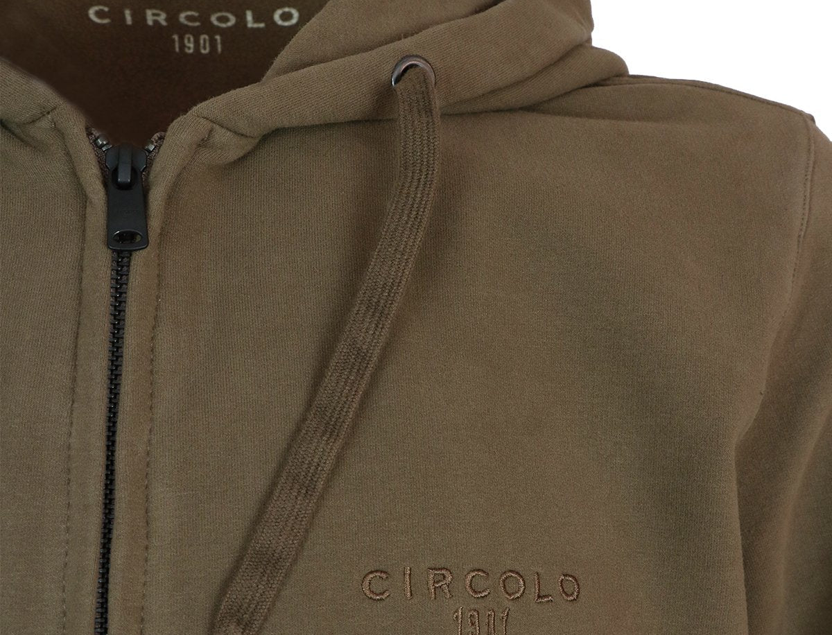 Get warm and snuggly in this Circolo 1901 zip hoodie jacket made of high-quality cotton this Fall. Features a ribbed hem and cuffs, functional front pockets, a sturdy zip closure, and the brand's logo intricately embroidered on the left breast. This crease-friendly piece is perfect for the carefree lover who enjoys keeping things simple. Complete the laid-back look with its matching joggers._Available in Green, Ecru Brown and Dark Brown.