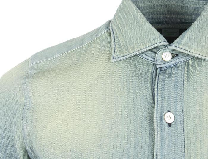 The �gNapoli�h shirt is Finamore's interpretation of the Neapolitan hand-made dress shirt. This washed denim shirt is classic in style and with a fitted sleeve_of_unique pleating to give the shoulder more flexible_movement._Cut from herringbone-woven cotton, the design is artfully faded at the chest to create the perfect worn-out look._